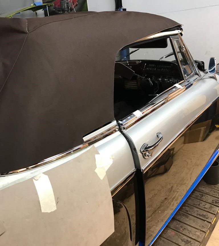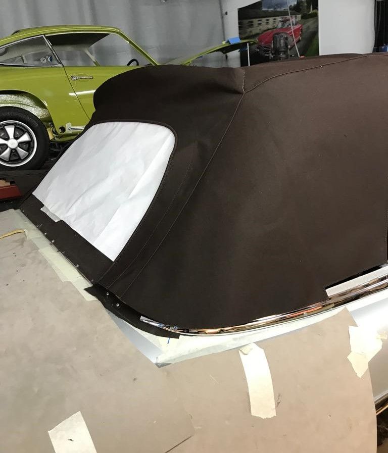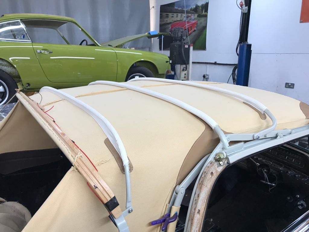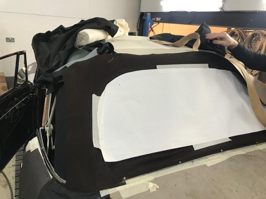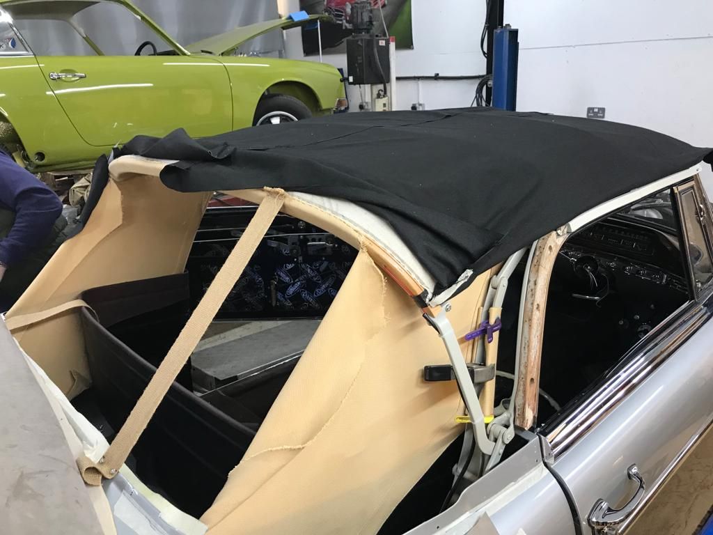 We’ve started the year with an expanded team and more space, which is allowing us to move more projects along simultaneously. Let’s start with the complicated multi-layer roof on the Mercedes 220S, now being fitted by Paul from Link Trim. It’s very similar to the roof on a Rolls Royce Corniche, and now the final covering is going on – edging closer and closer to this wonderful car being finished!