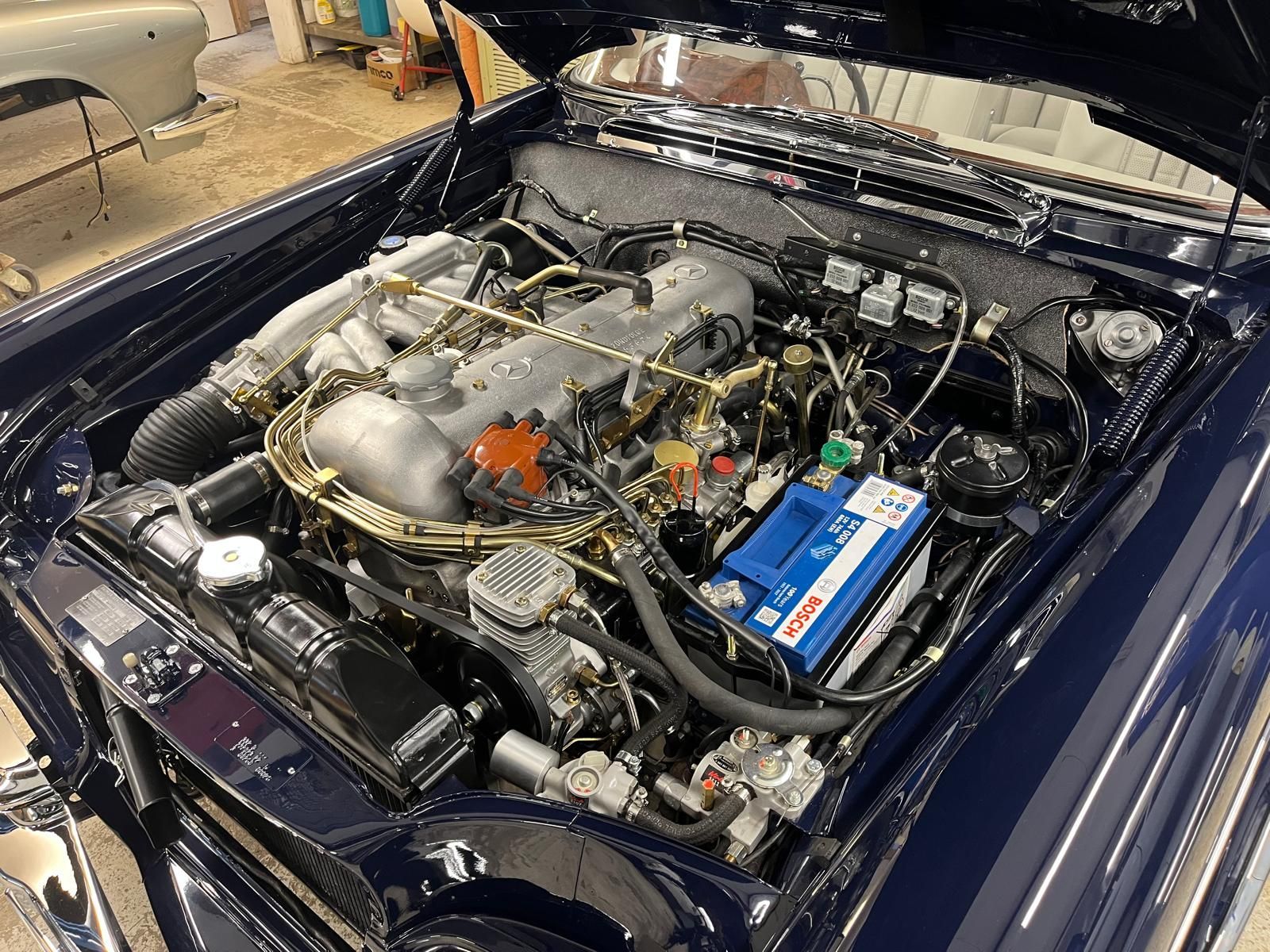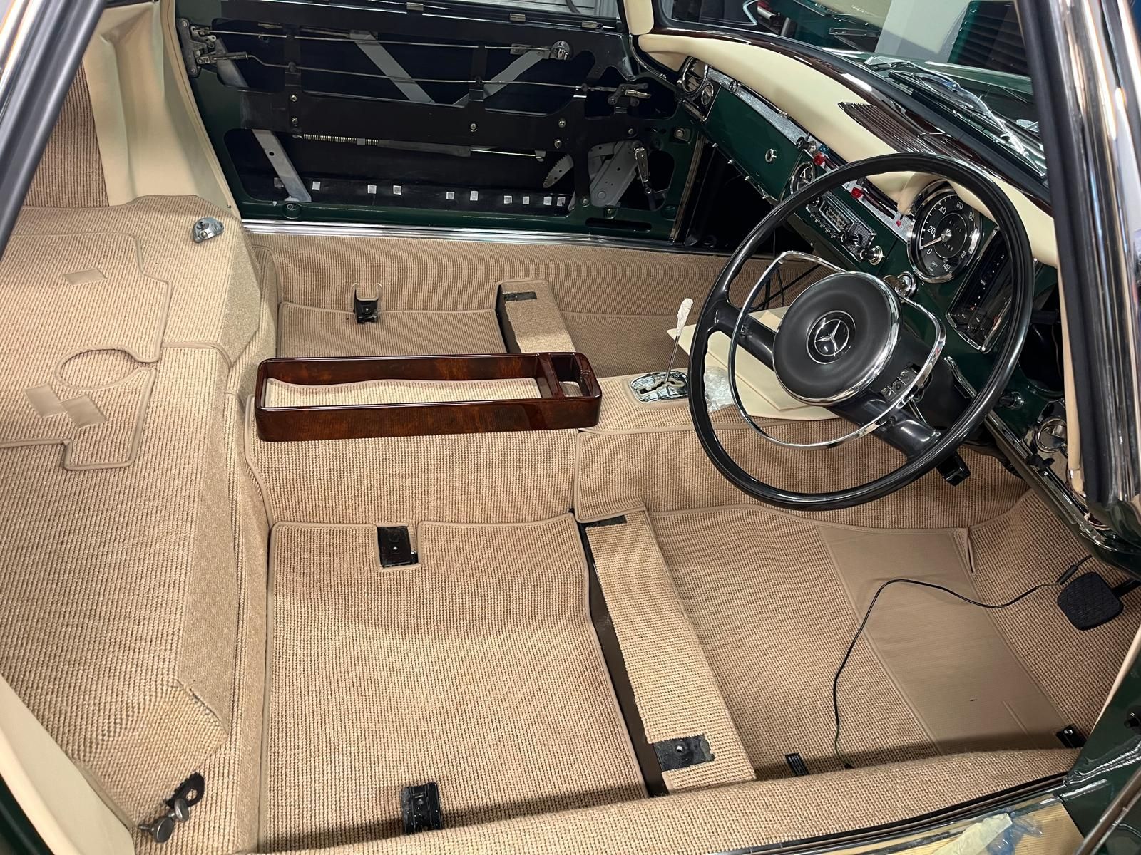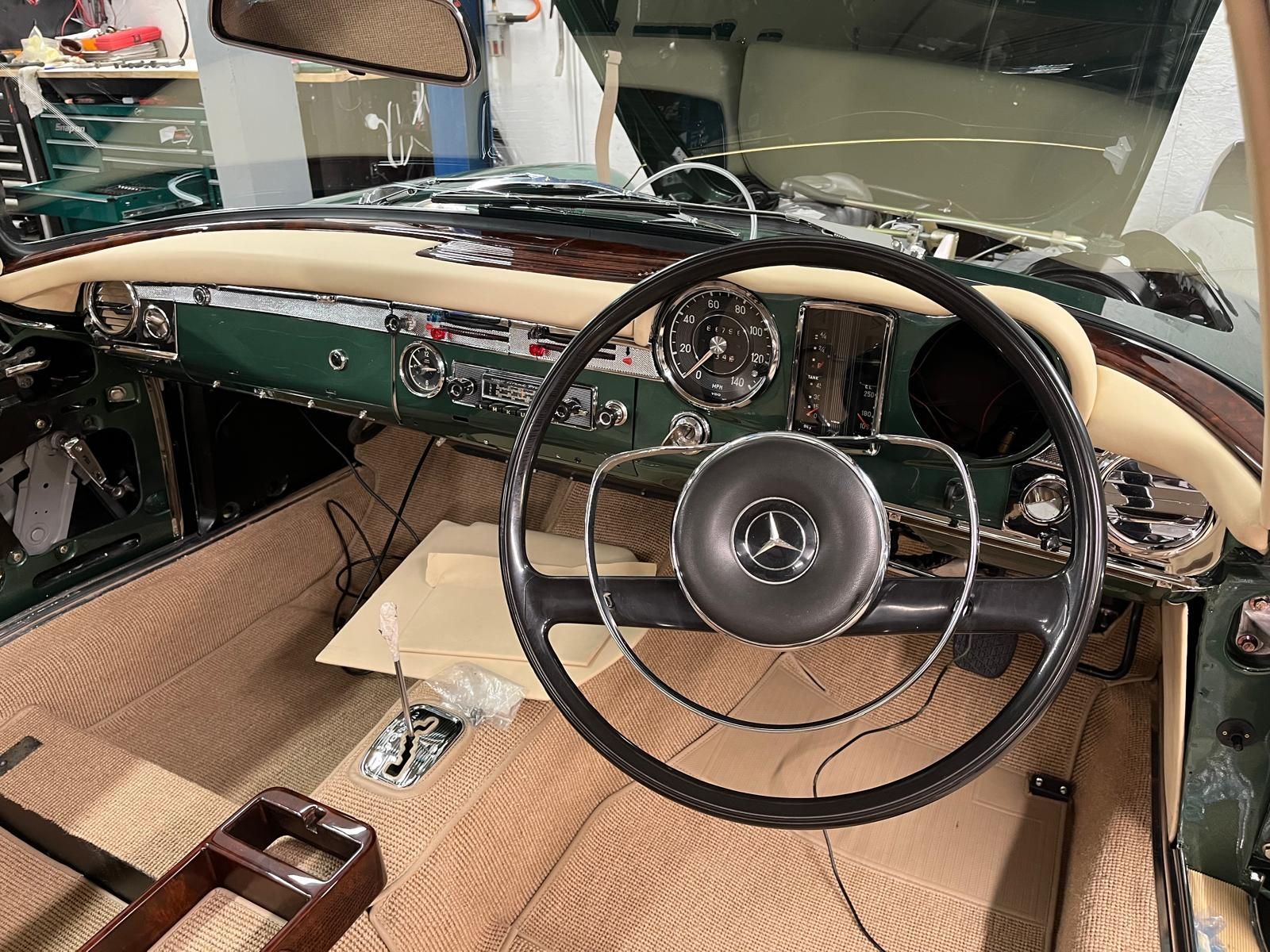 Our two Mercedes are coming along well – the 300SE is now complete and ready for testing – weather permitting – and we’ve started fitting the carpets in the Pagoda. The Aston is now almost ready for its next coat of primer, and meantime we’ve been preparing our new additional workshop.