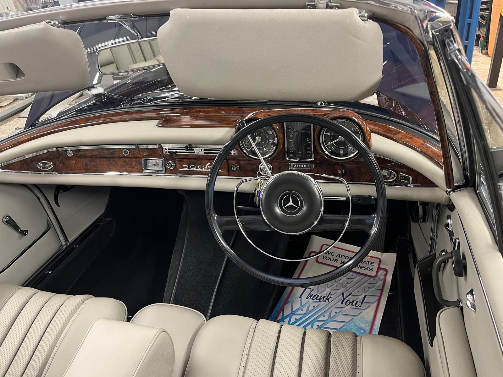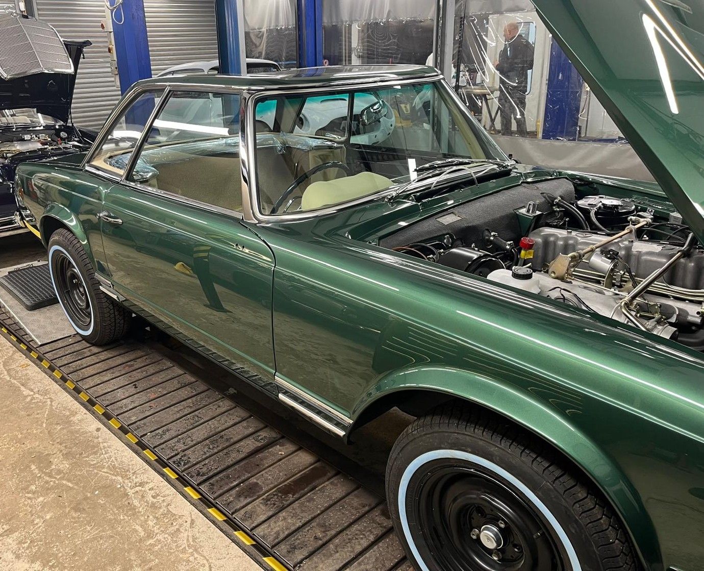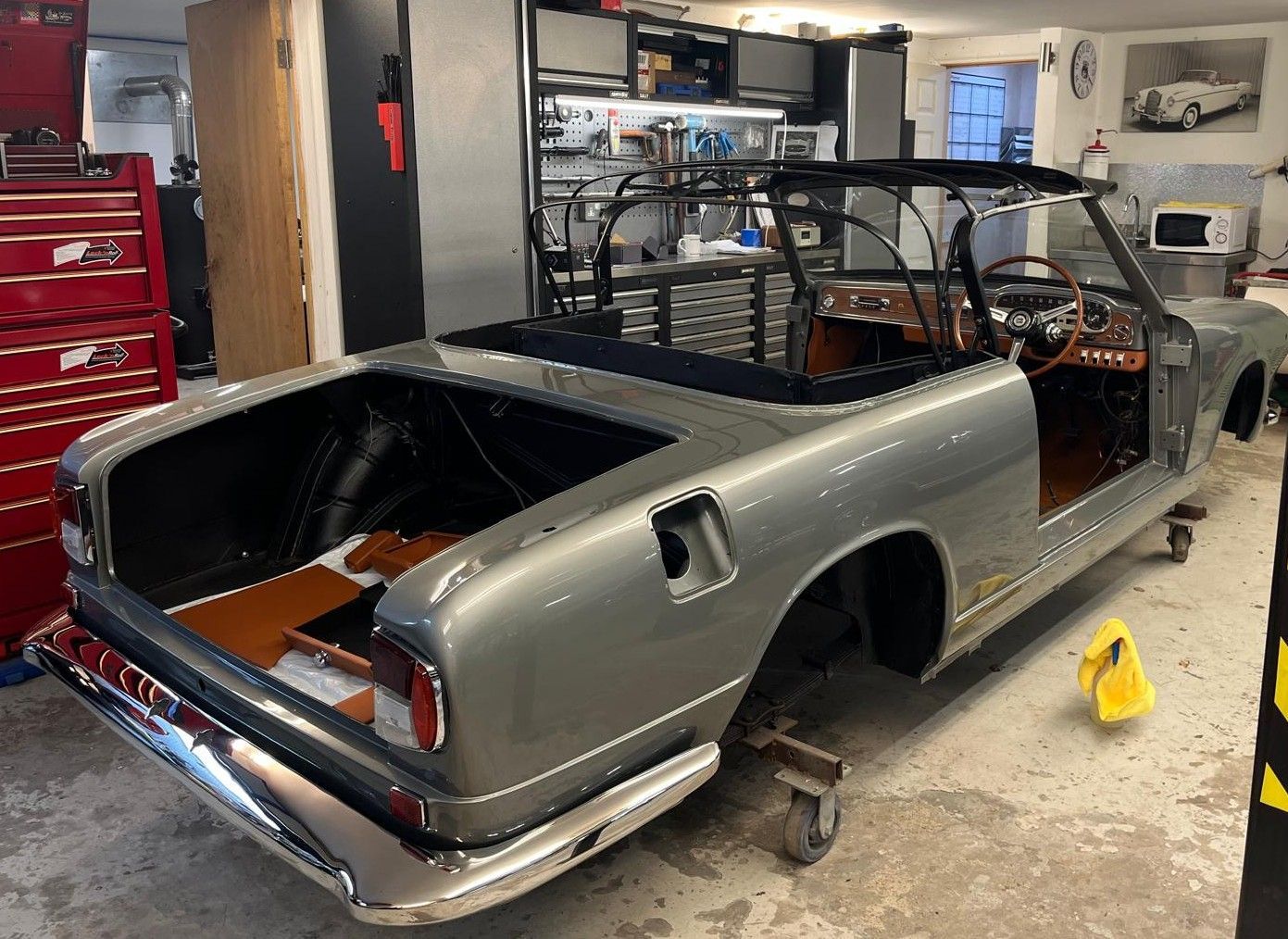 Our two Mercedes are coming along well – the 300SE is now complete and ready for testing – weather permitting – and we’ve started fitting the carpets in the Pagoda. The Aston is now almost ready for its next coat of primer, and meantime we’ve been preparing our new additional workshop.