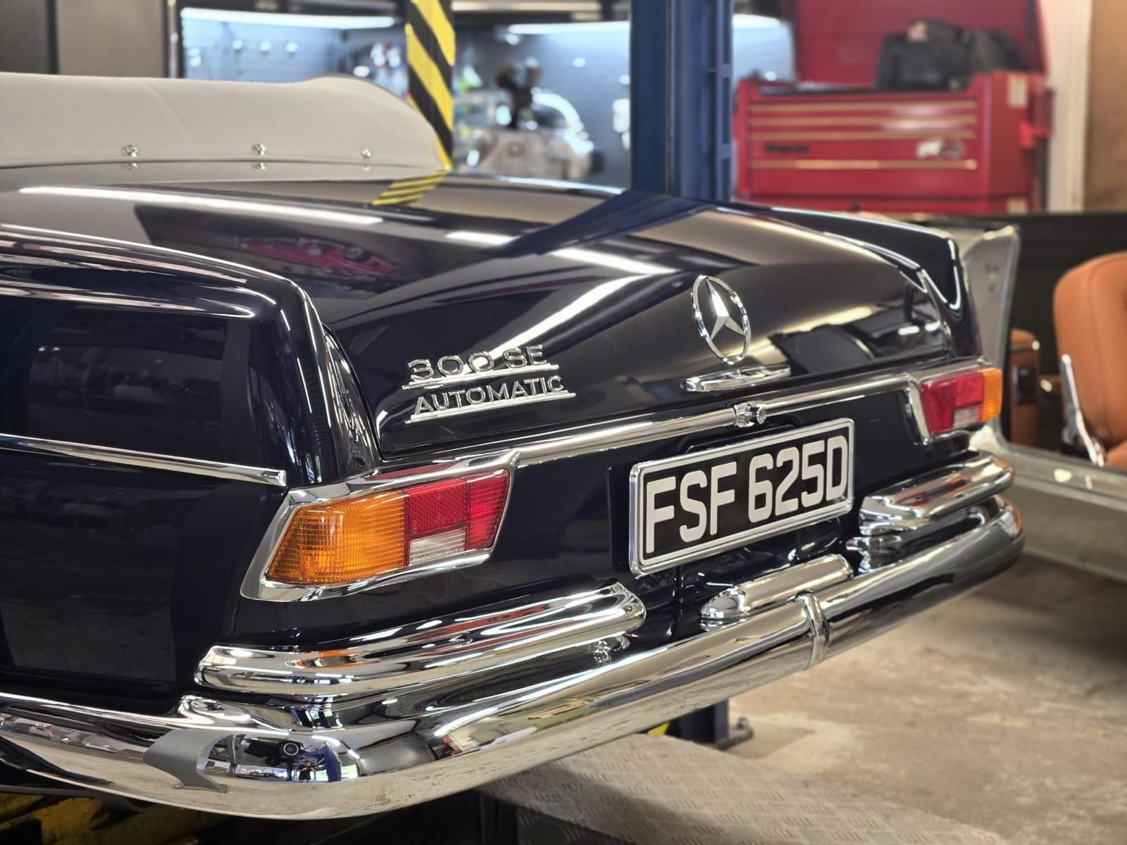 Two elegant classic Mercedes to focus on for this post – after re-fitting exterior and interior trim, the imposing dark blue 300SE just needs to be reunited with it’s newly-rebuilt engine before it can be returned to it’s owner – it looks amazing, even if we say it ourselves.