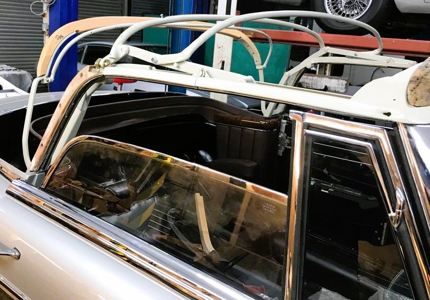 Finally, back with the Mercedes 220S, the hood frame has been refurbished and we’ve trial fitted it – this has been a complicated process!