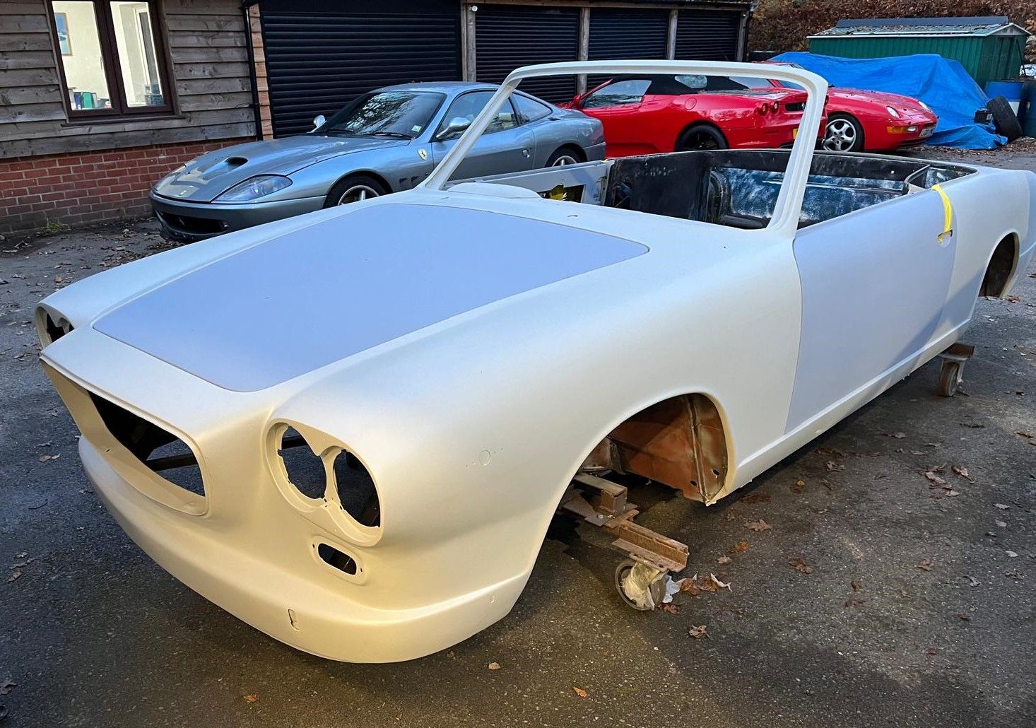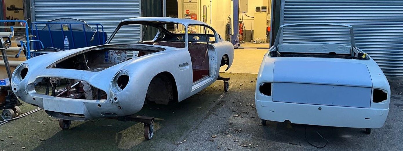 One of our long-term projects, the Lancia Flavia convertible, is now ready for final prep before going into the paint booth. Another long-termer, the DB6 has now been stripped of all it’s paint, underseal etc and is about to go into the metal shop.