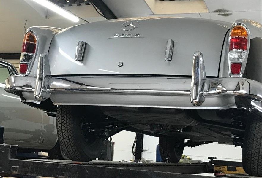 A Mercedes-focused week here at Templar Towers. We’re spending a lot of time and effort to bring the 1958 220S to completion – over the past few days we’ve trial-fitted the rear bumper and final-fitted the over-riders. All the interior wood has now been restored with really beautiful walnut veneer – all the pieces look fabulous – and the re-trimmed rear seat, after first fitting, is now ready for final fit. It’s painstaking and labour-intensive work, but this very elegant Mercedes is going to look stunning when it’s finished, even if we say so ourselves!