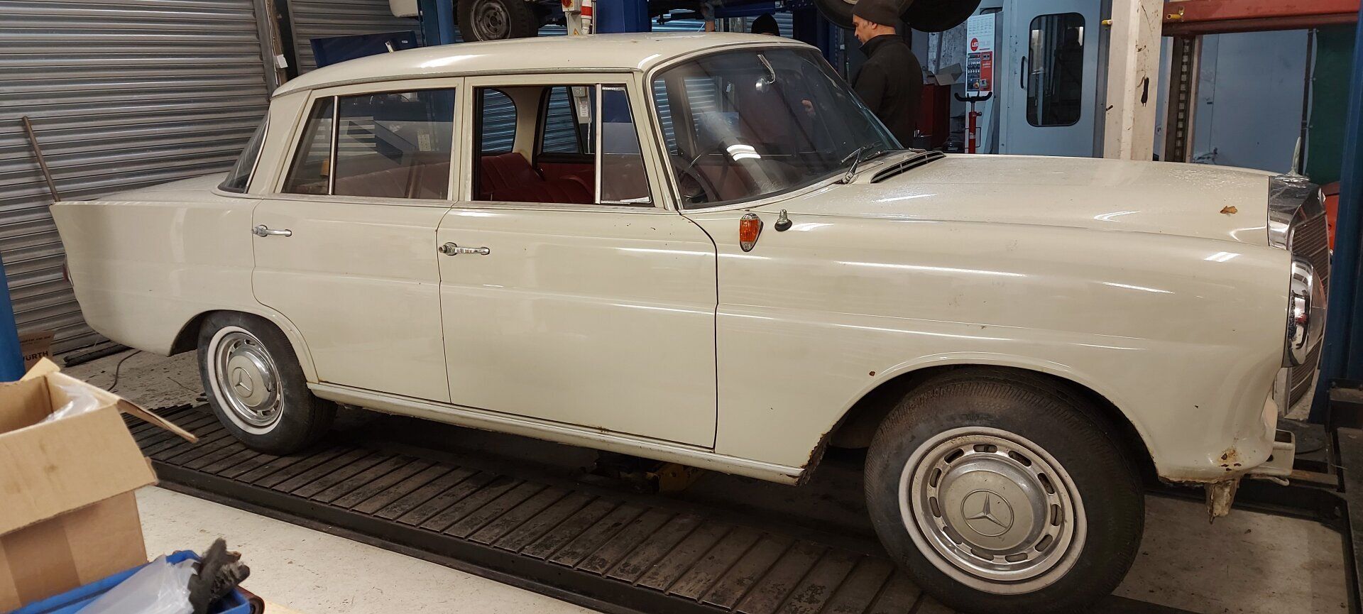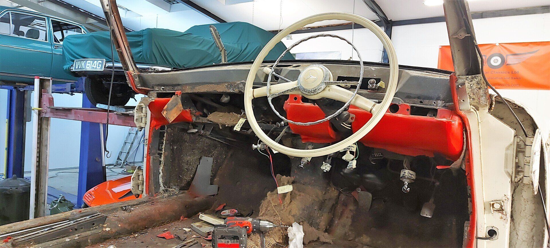 Work on taking apart the 1957 Mercedes 220S convertible is now well under way - the engine is out, front wings are off, the interior is out...so far, nothing untoward but we're still in the early stages on this one. We've also begun working on the 190 Fintail, which also looks very solid so far. Watch this space for future updates!