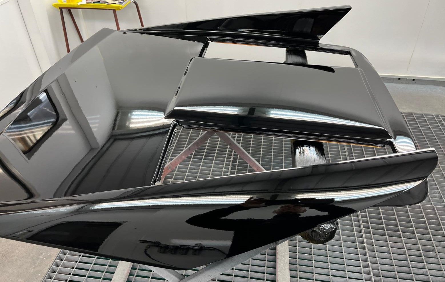 The DB6 is now on a trolley – the next step will be to clean it properly underneath before it goes for metalwork repairs. The doors and some panels from our 308GTB are now black, the body will be next. Another Ferrari, the Testarossa, is in to have it’s injection system overhauled.