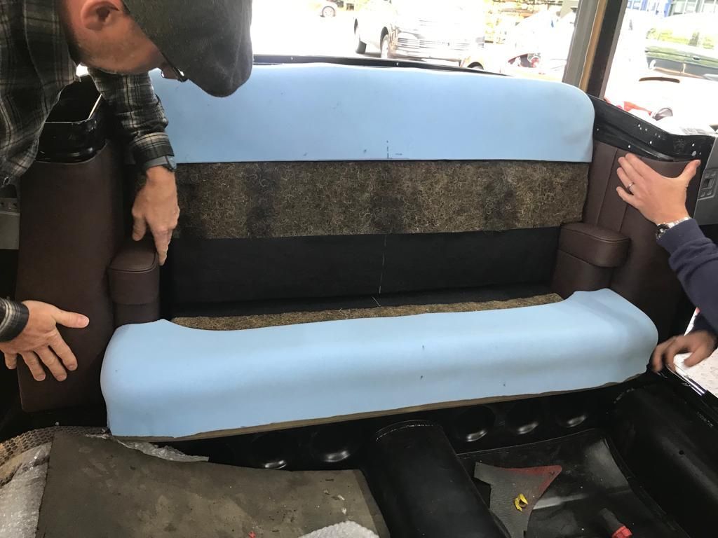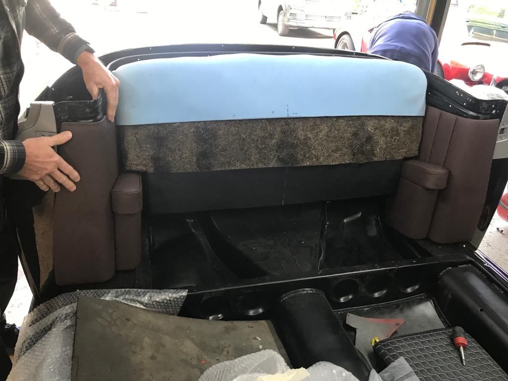 Our Mercedes 220S is now looking more and more like a complete car as we work our way around it, and here’s the re-foamed rear seat being trial fitted to make sure it’s exactly the right size. Meanwhile we’ve also been wiring and fitting the lights – gradually recreating this fabulous car.